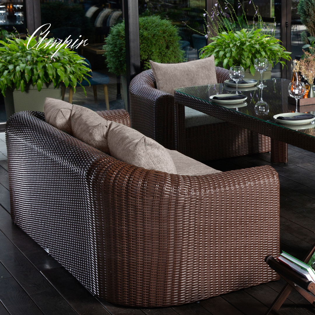 The AMPIR FAMILY Wicker Outdoor Sofa Set with Lounge Armchairs by TERICO is the perfect choice for large outdoor gatherings. This set invites groups to sit down on sofas and dining chairs with comfortable cushions for a day of enjoying the sun and good company. All cushions in this set are guaranteed to resist mold and bacteria for years of unmatched comfort and style. The set is completed by table with lay on glass top for a touch of reflective appeal. Boasting woven cellulose strands, durium finish, and a durable aluminum frame this luxury outdoor lounge armchair set is truly "Woven for Life." All TERICO furniture is guaranteed under warranty to resist cracking, fraying, and peeling.