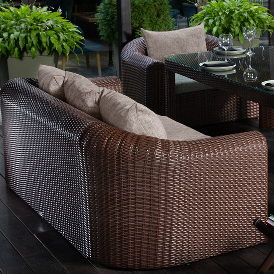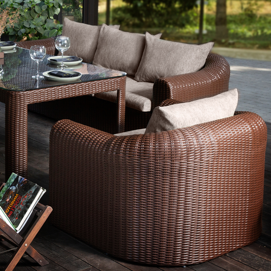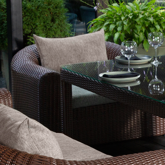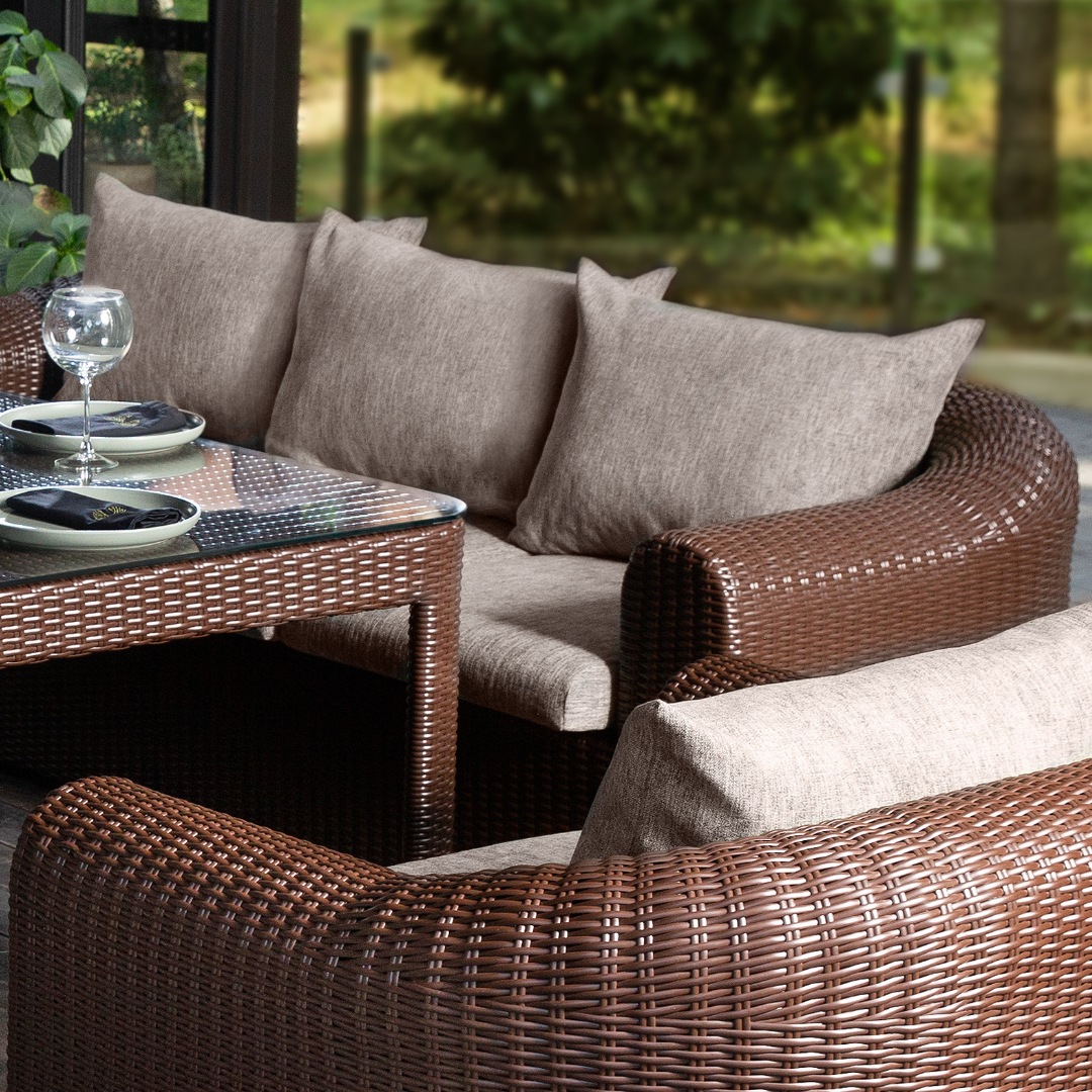 Perfect for outdoor dinner parties, this set from TERICO comes equipped with two cushioned dining armchairs & sofas and one large rectangle dining table.